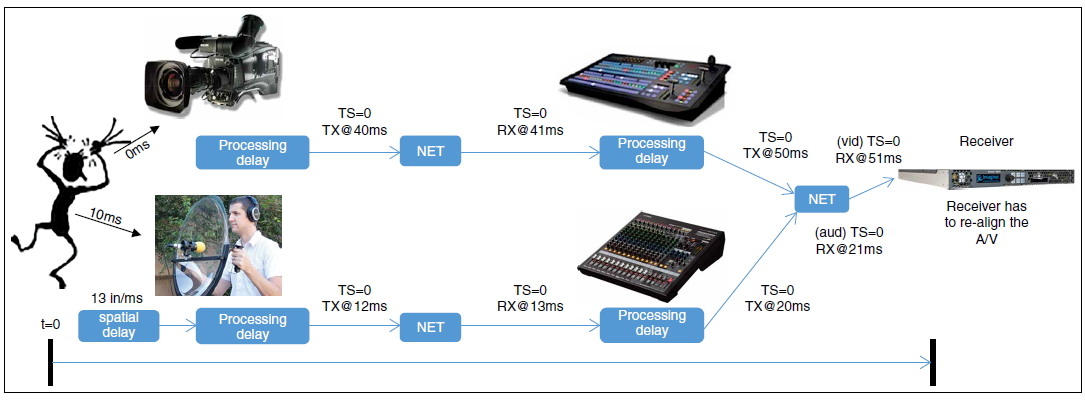 Поскольку аудио и видео передаются отдельными потоками с разными задержками, необходимо использовать специальные методы для их выравнивания, чтобы избежать рассинхронизации звука и картинки (lip sync). Разница в задержках возникает из-за того, что сигналы проходят через разные сетевые узлы и процессы обработки. Техническая рекомендация VSF TR-04 описывает метод совместного использования потоков ST 2022-6 и TR-03 для решения этой проблемы.